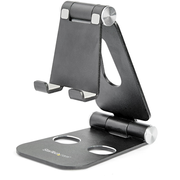 The adjustable multi-angle phone and tablet stand offers hands-free access to your smartphone/tablet at any viewing angle; Durable aluminum w/ satin black finish & silver highlights