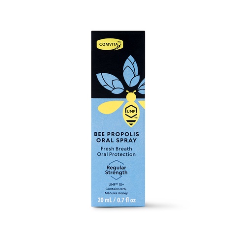 Support your Oral hygiene with Comvita Propolis Oral Spray Regular Strength. A natural, bee propolis Oral spray that helps fight odor causing bacteria, hydrates and freshens the mouth. Contains 10% manuka honey (UMF10+) for extra immune boosting antioxidants to strengthen your natural defenses.