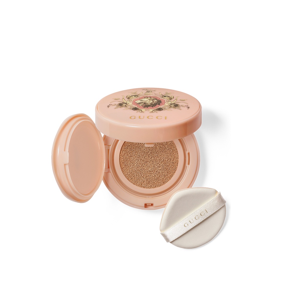 Gucci Beauty introduces Cushion De Beauté, the luminous and moisturising foundation in a cushion compact format that your skin will love. An ideal on-the-go beauty tool, Cushion De Beauté luminous cushion foundation is formulated with SPF 20 PA++, anti-pollution and anti-blue light properties, while delivering up to 24-hour hydration and moisturising actives. Super lightweight, the Gucci cushion foundation blends seamlessly into the skin and provides natural-looking, buildable coverage. Marvel at the unique lion design on the cushion compact as you complete morning routines, or while touching up throughout the day. The formula and application This Gucci foundation features high-reflection index oils and mineral powders that maximise the reflection of light on the skin to provide a luminous finish. A moisturising complex composed of Glycol and Glycerin deeply hydrates the skin for up to 24 hours, while the Black Rose Oil, one of Gucci Beauty’s key ingredients, offers antioxidant protection. External aggressors are fought by the luminous Gucci foundation's anti-pollution complex composed of Lipochroman and Butterfly Bush Extracts, while skin is protected from the sun with mineral SPF 20 PA++ filters that help to reduce the risk of damage. The design and range Available in six foundation shades, Cushion De Beauté is encased within a refillable pastel pink compact, housed with a mirror and a soft cushion applicator. A distinctive Gucci design adorns the top of the round casing, which features a lion pattern surrounded by a wreath of flowers. Desirable and playful, the outer packaging also features the same design.