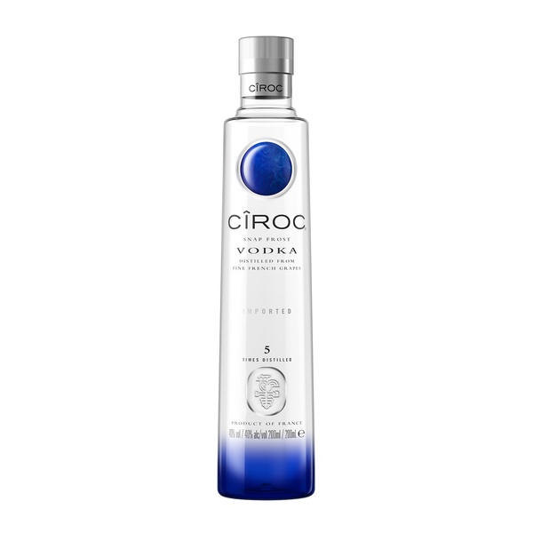 Ciroc is one of the only vodkas in the world made from fine French grapes Ciroc has won double gold at the 2010 San Francisco World Spirits Competition Ciroc vodka has an exceptionally smooth and delicious citrus taste Ciroc can be enjoyed in a Ciroc Blue Stone long drink 40ml Ciroc, 20ml Lemon Juice, 10ml Vanilla Syrup, topped with soda Ciroc is the perfect gift to bring to the chicest at home celebrations Tasting notes:Made from fine French grapes, our CiROC snap frost vodka has a characteristically smooth and clean profile.