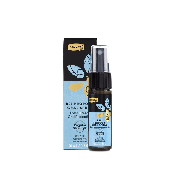 Support your Oral hygiene with Comvita Propolis Oral Spray Regular Strength. A natural, bee propolis Oral spray that helps fight odor causing bacteria, hydrates and freshens the mouth. Contains 10% manuka honey (UMF10+) for extra immune boosting antioxidants to strengthen your natural defenses.