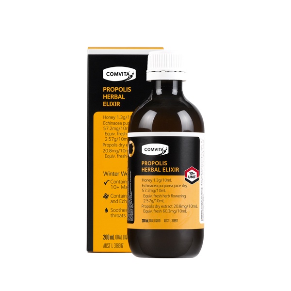 Propolis Herbal Elixir is a natural all-in-one herbal formula designed to support winter wellness and to soothe dry throats.
