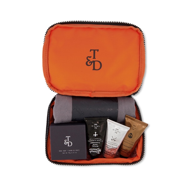1 x Black Canvas Bag of joy. T&D's signature water-resistant orange lining protects your potions inside our toiletries bag. The wide clam-style zip opening lets you organise & access your entire range of supplies quickly plus the robust yet flexible canvas outer saves crucial space in your carry-on. L: 200mm x H: 80mm x D: 140mm approximately (8in x 3in x 5.5in)