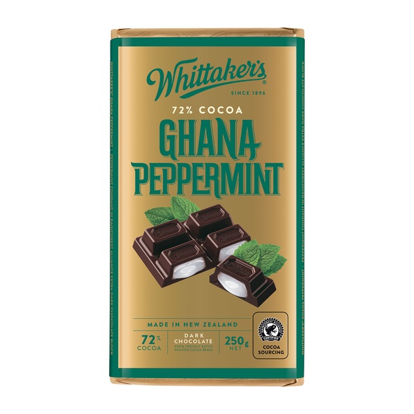 A beautiful contrast of rich 72% ghanaian cocoa, dark robust chocolate with the clean, fresh and velvety peppermint fondant filling, brought together in our generous 250g block.