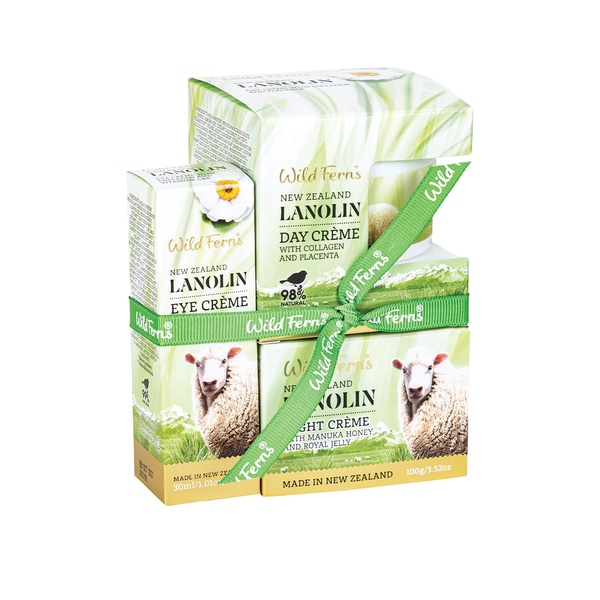 This Lanolin Set contains our high quality Lanolin Day Crème with Collagen and Placenta, Lanolin Night Crème with Manuka Honey 80+ & Royal Jelly, and Lanolin Eye Crème with Collagen and Vitamin C& E. Lanolin has long been renowned for its extremely beneficial moisturising and nourishing properties and therefore is ideal as a key ingredient in Wild Ferns Lanolin skincare. Lanolin is readily absorbed into the skin, making it look and feel softer, whilst improving the suppleness and elasticity associated with healthy, youthful skin. Included in our Lanolin skincare are beneficial botanical ingredients to further enhance conditioning and rebalancing benefits of these cremes and lotions.