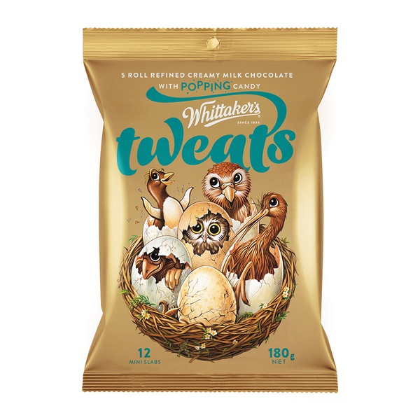 Distinctively & uniquely kiwi! tweats are a cascade of candy-popping creamy chocolate goodness, with some of new zealand’s most iconic native bird species reimagined in your favourite chocolate! with a classic native selection of the iconic kiwi, the infamously now extinct moa, the bright-eyed night owl morepork, penguins, the prehistoric still active tuatara, and nz’s very own native parrot, the kakapo.