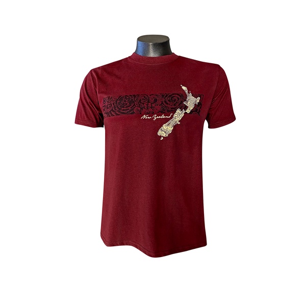 Prokiwi Adults T-Shirt Map Kowhaiwhai Burgundy Marl