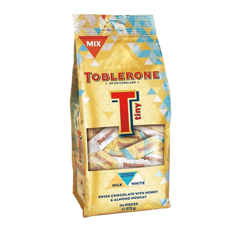 Toblerone Tiny Crunchy Almonds – one of the most successful flavors is now available in a new format! The iconic triangular milk chocolate with honey and almond nougat enriched with crunchy caramelized almonds and a drop of salt offered in a shiny, travel exclusive blue and golden bag of 34 individually wrapped snack-sized pieces. Perfect to share with your loved ones. Made in Switzerland.