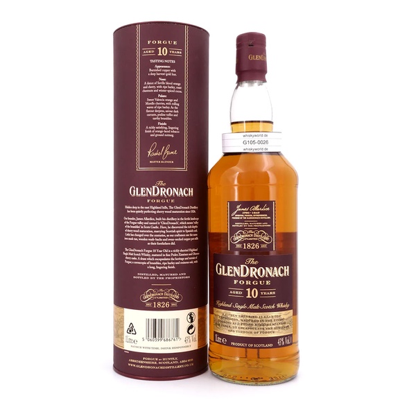 The GlenDronach Forgue Aged 10 Years is a richly sherried Highland single malt, matured in Pedro Ximenez and Oloroso sherry casks. A dram which encapsulates the heritage and terroir of Forgue: a cornucopia of brambles, ripe barley and resinous oak, with a long, lingering finish.