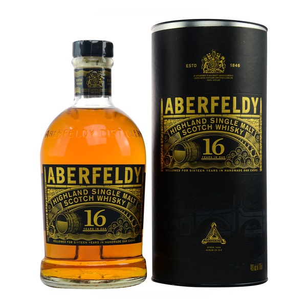 Aberfeldy Highland Single Malt. Situated on land famous for deposits of Gold, we use a longer fermentation for Honeyed richness. Aged 16 Years and finished in Madeira Casks.