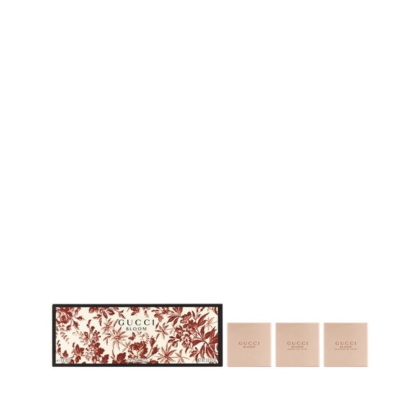 A trio of three soaps from the Gucci Bloom fragrance family, the Gucci Bloom original scent, Bloom Acqua di Fiori, and Bloom Nettare di Fiori, the soaps are enriched with Shea butter, clean the skin and leave it smooth and fresh. The hands and body are left lightly perfumed with the delicate Bloom scent signature of Jasmine Bud, Tuberose and Rangoon Creeper notes. Use the Gucci Bloom Perfumed Soaps together with Gucci Bloom Body Cream, Body Oil and Hair Mist to reveal the sillage of the scent, and impart a sense of harmony and indulgence for the body.