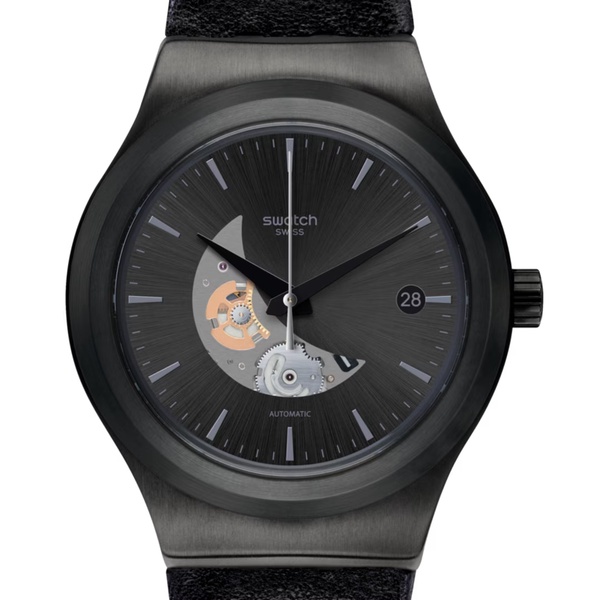A halfmoon window on the sun-brushed dial of SISTEM PILOTE (YIB404) lets you see the automatic movement inside. This black watch has a black leather strap.