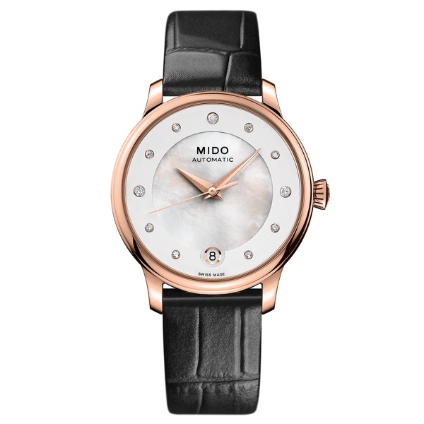 The classical Baroncelli LadyDay Swiss watch is an extremely feminine timepiece inspired by a historical model. With its harmonious lines, mother-of-pearl dial and diamonds, it is the final touch to a perfect day or night look. Its automatic movement furthermore offers a date function and up to 80 hours of power reserve.33mm Case , Up to 80 Hours Power reserve, 50m Water Resistant, Date