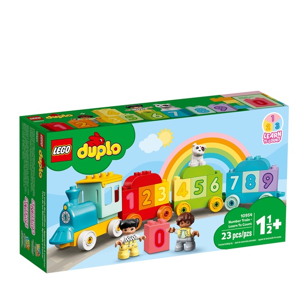 Catch the colorful new LEGO DUPLO My First Number Train - Learn To Count (10954). With 10 number bricks for toddlers to load, unload, stack and sort, plus girl, boy and dog DUPLO figures – the play-and-learn fun never ends. Toddlers can place the number bricks on and off the wagons, line them up in the correct order and build them together into a number wall. With moving wheels, an opening roof and friendly DUPLO characters to share the fun, the Number Train will transport your toddler to a world of imaginative, developmental play!