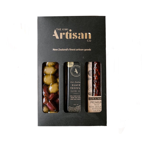 Enjoy our unique gift pack including Manuka smoked olives, Wild Venison Salami, Truffle Oil.
