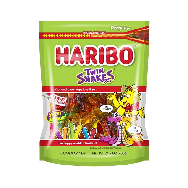 Twin Snakes is the perfect combination of sweet and sour. Two fruit gum snakes - one sweet, one sour - deliciously entwined. Pull the snakes apart or enjoy them together, your choice! The party size pack contains fruity duos in cherry & orange, blueberry & blackcurrant and apple & lemon.