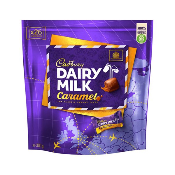 A pouch filled with Cadbury Dairy Milk individually-wrapped miniature bites with a soft Caramel center. It comes in a large sharing pouch, ideal for sharing with friends and family.