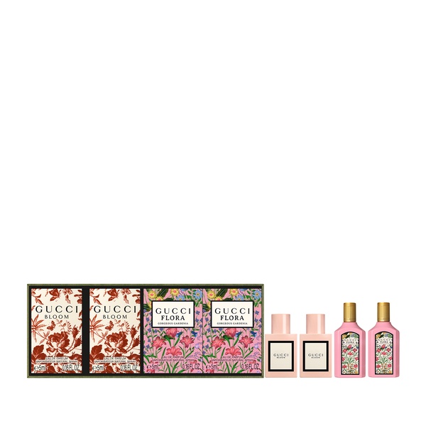 This set contains: - 2 x 0,16 fl.oz/5ml Gucci Bloom Eau de Parfum miniature - 2 x 0,16 fl.oz/5ml Gucci Flora Gorgeous Gardenia Eau de Parfum miniature