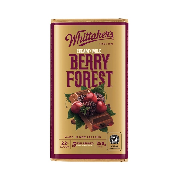 Discover delicately chewy cherry berry jubes, mixed with crunchy black cocoa biscuits, all hidden inside our super smooth, 33% cocoa, Five Roll Refined Creamy Milk chocolate. Now that’s a forest to get lost in.