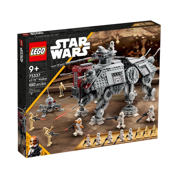Recreate the Battle of Utapau with this fantastic LEGO® Star Wars™ AT-TE Walker (75337). A great gift idea for Star Wars: Revenge of the Sith fans aged 9 and over, this building toy features posable legs, a 360-degree-rotating elevating heavy blaster cannon with 2 stud shooters, a detachable minifigure cockpit and 2 detailed cabins with space for up to 7 LEGO minifigures in total. Each of the cabins opens for easy play and an extendable handle makes it simple to lift and move the AT-TE.The set includes 5 LEGO minifigures – Commander Cody, a 212th Clone Gunner and 3 212th Clone Troopers – to pit against 3 Battle Droid LEGO figures and a buildable Dwarf Spider Droid, plus assorted cool weapons. Find building instructions in the box and on the LEGO Building Instructions app, which has interactive viewing tools to enhance the creative experience.