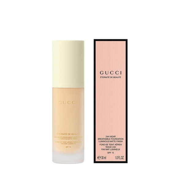 Gucci Éternité de Beauté 24-hour long lasting luminous matte foundation offers full coverage in one drop, yet with comfort** throughout the day. It is formulated with high skin affinity powders and coated pigments with an ultra-performant polymer technology that allows no transfer wear and shine control* that lasts all day. Infused with Hyaluronic Acid and Black Rose Oil, this Gucci foundation helps to boost and maintain skin hydration, while the Bamboo Powder helps to control shine. Blending the best of natural luminosity with a perfecting mattifying effect, this breathable and weightless foundation instantly blurs pores, evens the complexion, and blends away imperfections. The luminous matte finish is never dull and stays fresh all day long without looking cakey, perfect for everyday wear. Suitable for normal to oily skin, this moisturising foundation is available in 40 shades and made with SPF filters for skin protection. The range: A full range of 40 beautiful foundation shades matched to all skin tones–from deepest (5XX) to lightest (1XX) for every skin type. Calibrated across five shade families and harmonised to four undertones: cool (C), neutral (N), warm (W), and olive (O). Consumer test on 110 volunteers after 7 days of use: - *90% say shine is controlled throughout the day - **96% say their skin feels comfortable all day long.