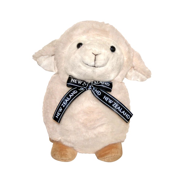 A 25cm soft plush sheep in cream colour with a black ribbon.
