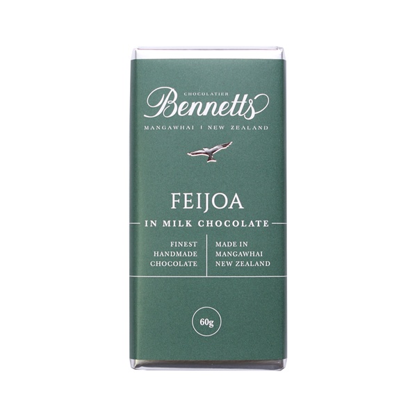 Ingredients:Milk Chocolate [(min. 34% cocoa solids), Sugar, Cocoa Butter, Whole Milk Powder, Cocoa Mass, Emulsifier: Soy Lecithin, Natural Vanilla Flavour], Feijoa, Natural Feijoa Flavour.