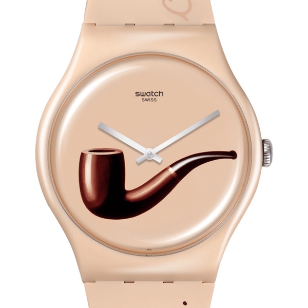 LA TRAHISON DES IMAGES BY RENÉ MAGRITTE features details of surrealist artist René Magritte's iconic work La Trahison des images (The Treachery of Images) printed on the multi-colored dial. The front of the strap plays with the surrealist nature of his work with the phrase, ""Ceci n'est pas une pipe. Ceci est une Swatch."" (""This is not a pipe. This is a Swatch.""). The loop is also printed with the name of the artist. La Trahison des images (1929), oil on canvas, 60 x 81 cm (Los Angeles County Museum of Art - Inv. 78.7.) © Succession René Magritte - SABAM, Belgium, 2023 / BKW Editions