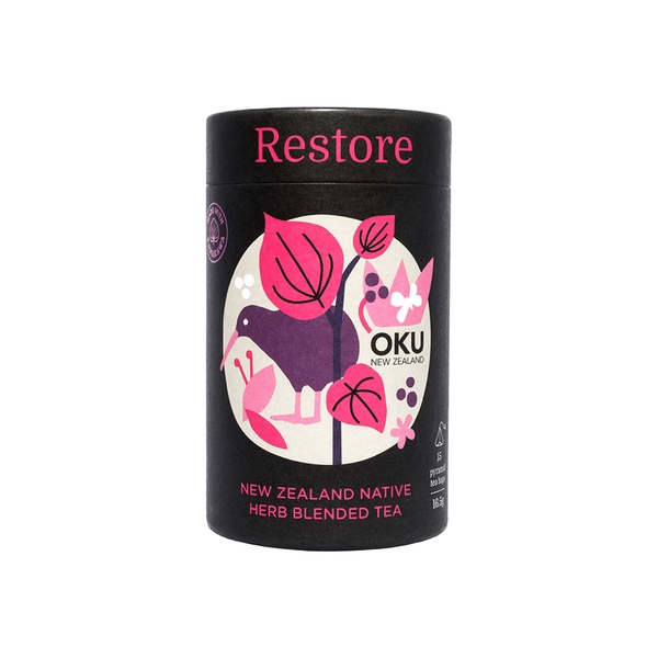 OKU NZ Restore NZ Native Herb Blended Tea brings together a remarkable blend of NZ Native herbs that combine Kawakawa, Karamu, Manuka and Kumarahou. These are combined with the spiciness of cinnamon and nettle leaf that is well known in herbal folklore. Together these herbs create a truly unique combination.
