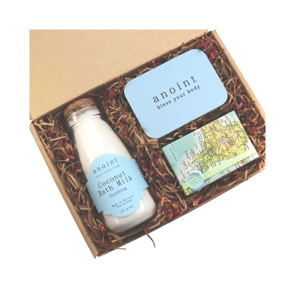 Anoint Refreshed Gift Set contains a bottle of Coconut Bath Milk and a Lemongrass Lotion Bar & Lotion Bar Storage Tin. The elements are nestled in shredded kraft paper with a sprinkle of rose petals and presented inside a kraft cardboard gift box, hand finished with an Anoint wax sealed and fabric backed label.