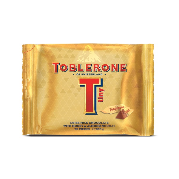 Toblerone Tiny - the iconic milk chocolate with honey and almond nougat - in a travel exclusive snack size format. Offered in a convenient travel exclusive bag containing individually wrapped pieces, this is every snacker's dream! Made in Switzerland (200g).