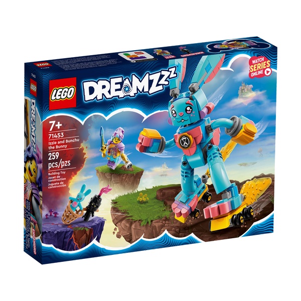 Let kids aged 7+ jump into the action of the dream world with this LEGO® DREAMZzz™ Izzie and Bunchu the Bunny (71453) building toy set. Based on an exciting storyline from the TV show, the set lets kids help main character Izzie create a large version of her favourite cuddly toy to help rescue the stuffed animal, which has been kidnapped by a nightmare Grimspawn. The large living version of Bunchu has a fully articulated neck, arms and legs. When building it, kids can use their imaginations and follow story-led building instructions to choose between equipping it with roller skates and gloves or bee wings and a stinger.