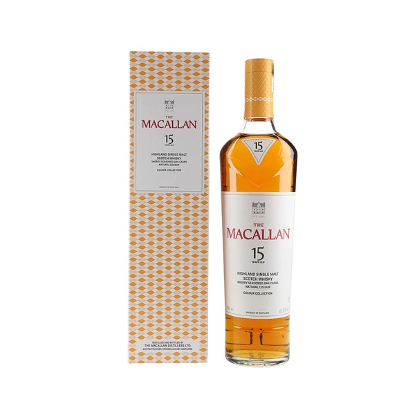 The Macallan 15 Year Old Colour Collection 700ml, a smooth whisky aged in sherry-seasoned oak casks from Jerez de la Frontera, Spain. Infused with citrus, vanilla, and baked peach notes, this natural beech-colored whisky is the perfect balance of new make spirit and exceptional cask maturation.