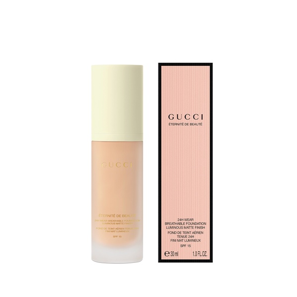 Gucci Éternité de Beauté 24-hour long lasting luminous matte foundation offers full coverage in one drop, yet with comfort** throughout the day. It is formulated with high skin affinity powders and coated pigments with an ultra-performant polymer technology that allows no transfer wear and shine control* that lasts all day.