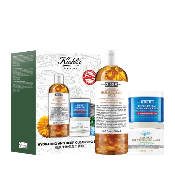 This set contains: 1 x Kiehl's Calendula Herbal Extract Toner 500ml, 1 x Kiehl's Ultra Facial Fresh Gel Cream 125ml, 1 x Kiehl's Rare Earth Deep Pore Cleansing Masque 125ml