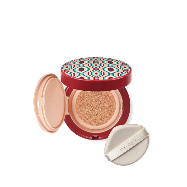 This holiday season, Gucci Beauty introduces Cushion De Beauté Limited-Edition Holiday 2023, the luminous moisturising foundation in an exclusive, limited edition precious cushion compact. Ideal when on the move, Cushion De Beauté luminous cushion foundation is formulated with SPF 20 PA++, anti-pollution and anti-blue light properties, and delivers up to 24-hour skin hydration with moisturising actives. Super lightweight, the Gucci Beauty cushion foundation blends seamlessly into the skin and provides natural-looking, buildable coverage. The formula This Gucci foundation features high-reflection index oils and mineral powders that maximise the reflection of light on the skin to provide a luminous finish. A moisturising complex composed of Glycol and Glycerin deeply hydrates the skin for up to 24 hours, while the Black Rose Oil, one of Gucci Beauty’s key ingredients, offers antioxidant protection. External aggressors are fought by the luminous Gucci foundation's anti-pollution complex composed of Lipochroman and Butterfly Bush Extracts, while skin is protected from the sun with mineral SPF 20 PA++ filters that help to reduce the risk of damage. The range and design Available in 3 shades: 03, 02.5, 02, Gucci Beauty Cushion De Beauté Limited-Edition Holiday 2023 is encased in a refillable cushion compact, complete with a mirror and soft cushion applicator. Presented in vibrant teal and red hues against classic gold, the lively geometric pattern celebrates the distinctive Gucci Beauty brand logo in its graphic variations. Inspired by Gucci's love for Art Deco and mixed patterns, the precious limited-edition packaging captures the essence of holiday wonder.