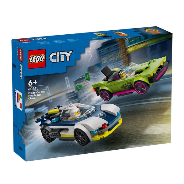 Unleash high-speed fun and excitement with this police car toy playset for kids aged 6 and over. The LEGO® City Police Car and Muscle Car Chase (60415) set for boys and girls features a cool police interceptor and a getaway vehicle, plus officer and crook minifigures for fun role play and storytelling.