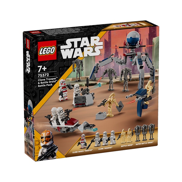 Inspire youngsters to recreate thrilling Star Wars: The Clone Wars scenes with this LEGO® Star Wars™ Clone Trooper & Battle Droid Battle Pack (75372) for ages 7 and over. It features 4 LEGO Star Wars minifigures and 5 LEGO figures – a Clone Shock Trooper, 3 Clone Troopers, 3 Super Battle Droids and 2 Battle Droids – with iconic weapons for action play. This LEGO building set also includes a stud-shooting Star Wars speeder bike for 2 Clone Troopers and a buildable STAP speeder vehicle toy for a Battle Droid. A tri-droid with 3 flick shooters and a defensive post with a stud shooter add even more creative-play possibilities.