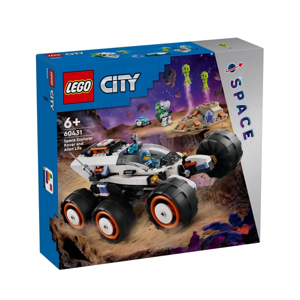 Navigating new worlds is child’s play with this LEGO® City Space Explorer Rover and Alien Life toy playset (60431) for ages 6+. The tough space exploration vehicle is equipped with 6 big tyres and advanced suspension for cruising over rocky planet terrain. Kids can join the crew as they map the planet surface and discover strange steam-jetting geysers and alien life. This fun set includes 2 space crew minifigures, and robot and alien figures.