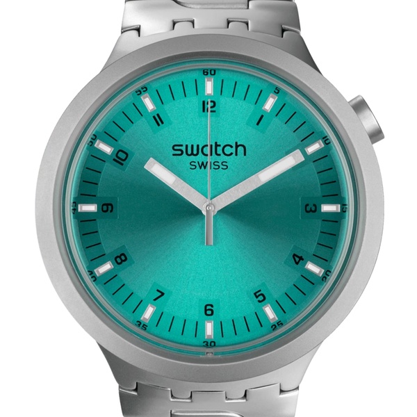 Featuring on this stainless steel oversize watch is a turquoise dial with sun-brushed finishing, black print and gray glow-in-the-dark hands. A stainless steel adjustable bracelet and sandblasted case and bezel finish off this turquoise big face watch.