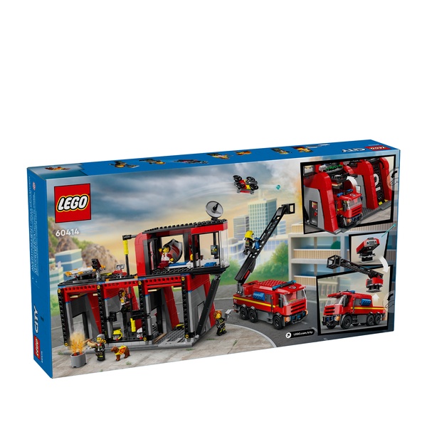 Spark kids’ imaginations with the LEGO® City Fire Station with Fire Truck (60414) toy playset for ages 6 and up. The station features a modern control center, kitchenette and sleeping quarters above an equipment area and 2 garages with tall up-and-over doors. The set also includes a toy drone and a cool fire engine with a modular ladder and extinguisher attachments. Mobilize the 5 fire-crew minifigures and fire dog figure for hours of action-packed firefighting role play. Kids can use this set with others from the LEGO City range (sold separately) for even bigger adventures!
