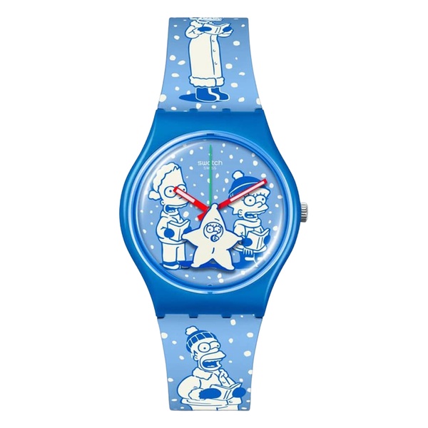 Part of the Simpsons collaboration collection, this blue Simpsons Holiday Special has a blue printed dial with red hands that glow in the dark and a biosourced case and glass. The scene on the watch is inspired by the very first episode of the beloved animated series. The glass features a white print of Maggie, the youngest member of The Simpsons family and the pale blue printed strap includes a contrasting dark blue loop and red buckle. TM & © 20th Television. Matt Groening