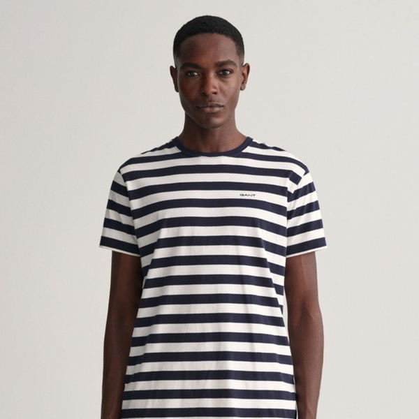 Classic, casual and subtly nautical, this T-shirt is crafted from 100% cotton and features yarn-dyed stripes. Cut for a regular fit with a crew neck, it is complete with a GANT logo embroidered at the chest.