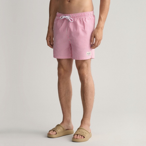 Crafted out of recycled polyester and cotton, the Classic Fit Seersucker Swim Shorts sport a classic length and feature an elastic waistband with a contrast color drawstring, side pockets, and a back pocket with a velcro closure. These easy-to-wear and classic swim shorts have a mesh inner pant and a woven GANT label sewn on at the bottom left leg.