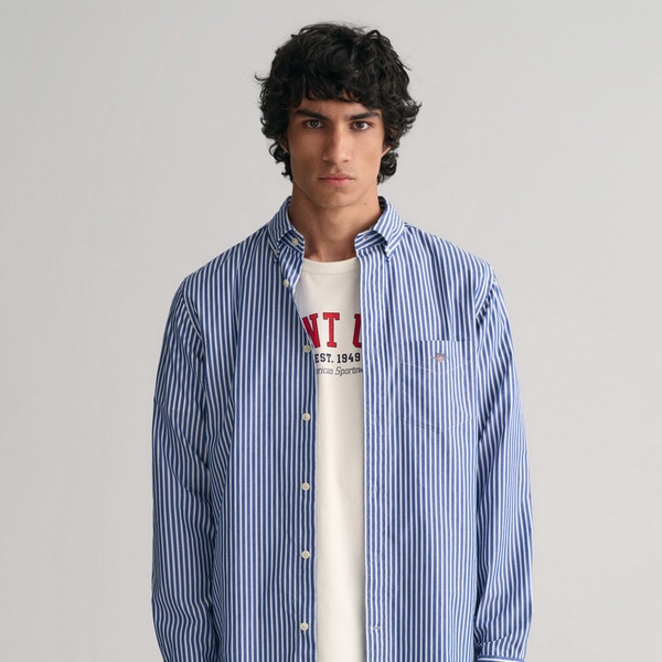Crafted in a durable cotton poplin, this classic shirt is essential to any preppy wardrobe. Designed with yarn-dyed stripes throughout the garment, this shirt is cut for a regular fit and features a button-down collar, curved hem and a box pleat with the signature locker loop at the back. It is accented with an '80s-inspired GANT shield graphic embroidered at the chest pocket.