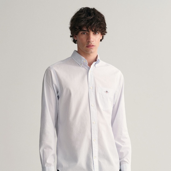 Crafted in a durable cotton poplin, this shirt is essential to any preppy wardrobe. Featuring a classic Banker Stripe pattern, this shirt is cut for a regular fit and features a button-down collar, curved hem and a box pleat with signature locker loop at the back. It is accented with an '80s-inspired GANT shield graphic embroidered at the chest pocket.