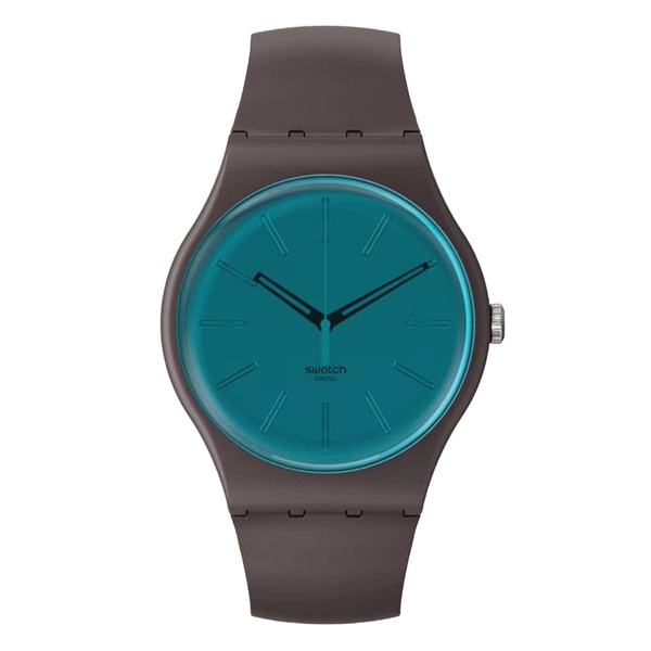 With its polished mirror dial with black hour and minute hands in a biosourced case and transparent blue biosourced glass, this brown watch with a blue buckle and loop features a special engraving technique that gives it a shimmery finish.