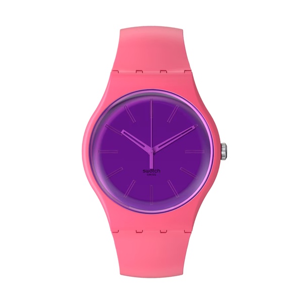 With its polished mirror dial with white hands in a biosourced case and transparent violet biosourced glass, this pink watch with violet buckle and loop features a special engraving technique that gives it a shimmery finish.