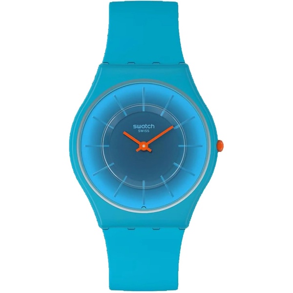 This ultra-slim watch radiates blue from its gradient print dial with blue indexes in a biosourced case and glass to its strap with matching loop and buckle. Orange hands and crown add a fun contrast to this blue watch.