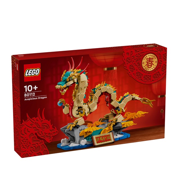 Usher in the Year of the Dragon with this majestic LEGO® Spring Festival Auspicious Dragon figure (80112). A meaningful, symbolic cultural gift toy for yourself or kids aged 10 and over, this LEGO brick-built mythical creature features a tilting head and an opening mouth. Specially printed elements for the eyes and scales enhance its authentic look. The buildable toy dragon holds a traditional blue crystal element and is sitting on a brick-built rock in the sea. Attach the nameplate to complete a dramatic display.
